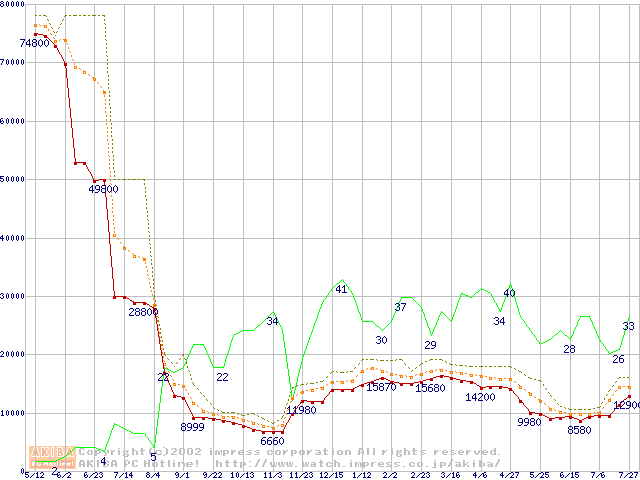 メモリ主要製品(最安値1万円以上)の最安値推移