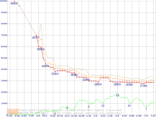 メモリ主要製品(最安値1万円以上)の最安値推移