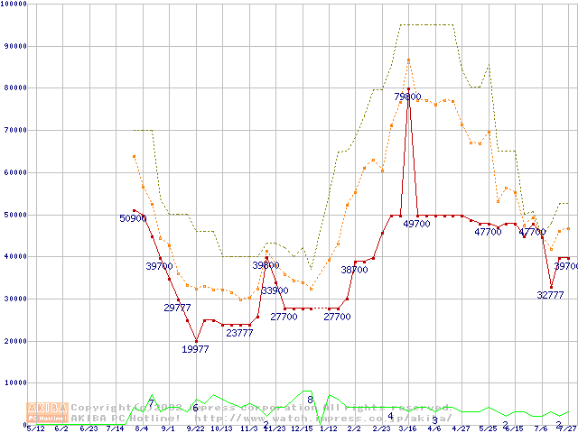 PC133 SDRAM DIMM CasLatency=3 ECC対応 Registeredタイプの最安値推移