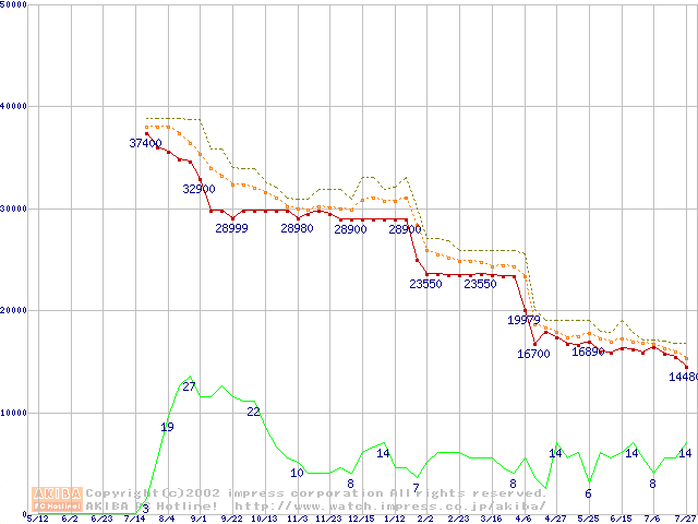 Socket 370 (FC-PGA2,FSB 133MHz,L2 256KB)の最安値推移