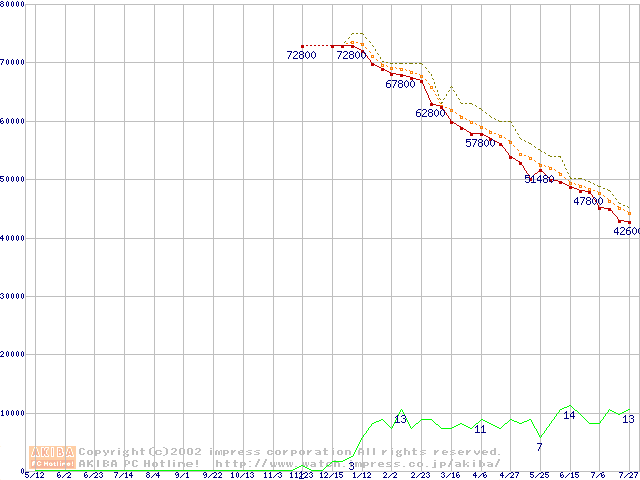 Travelstar 60GH (12.5mm,5400rpm,UltraATA/100,15GB/Platter,2MB,流体軸受)の最安値推移
