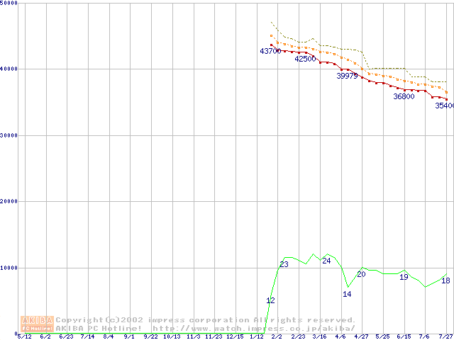 Socket 370 (FC-PGA2,FSB 133MHz,L2 512KB)の最安値推移