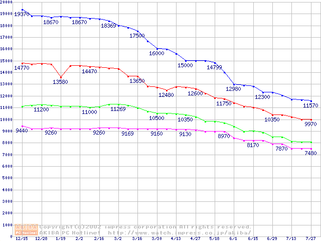 | [↑前グラフ]: | DiamondMax Plus D740X (7200rpm,UltraATA/133,40GB/Platter,流体軸受)の最安値推移 |
