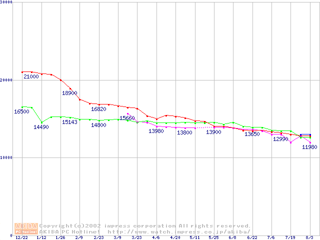 | [↑前グラフ]: | 2.5インチHDD 20GB~30GB未満(9.5mm厚)の最安値推移 |