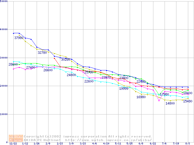 | [↓次グラフ]: | HDD主要製品(最安値2万円以上)の最安値推移 |