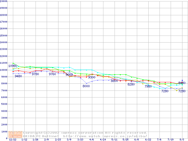 | [↑前グラフ]: | HDD 30GB~40GB未満(5400rpmクラス)の最安値推移 |