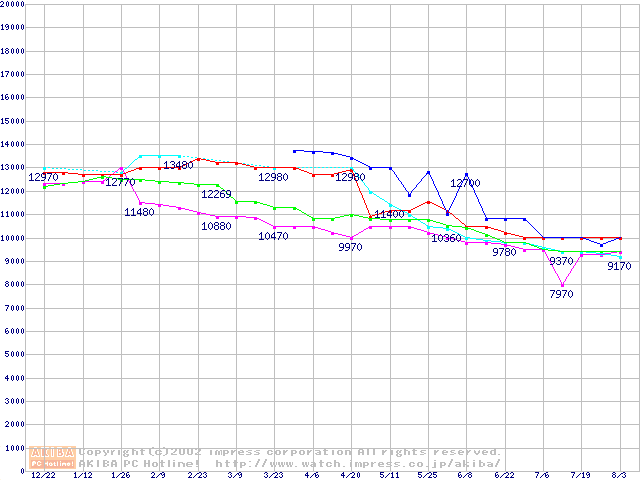 | [↑前グラフ]: | HDD 40GB~50GB未満(5400rpmクラス)の最安値推移 |
