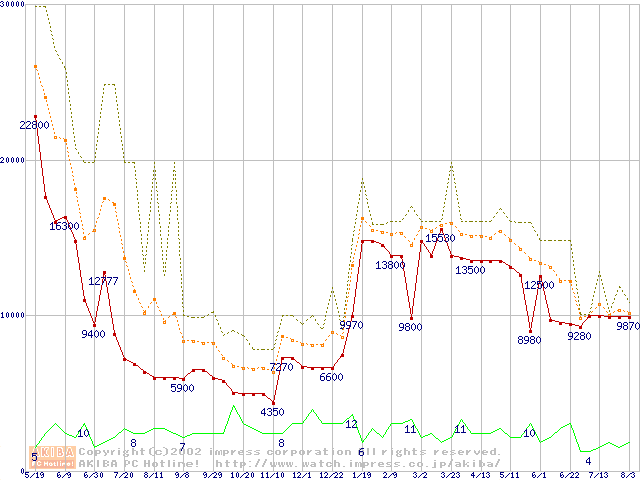 PC100 SDRAM DIMM CasLatency=2の最安値推移