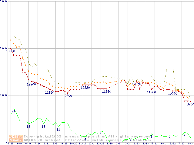 Socket A (Thunderbird,PGA,FSB 200MHz,L2 256KB)の最安値推移