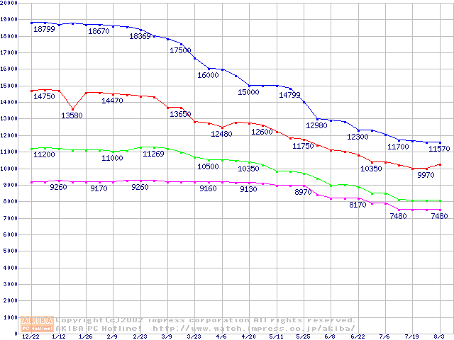 | [↑前グラフ]: | DiamondMax Plus D740X (7200rpm,UltraATA/133,40GB/Platter,流体軸受)の最安値推移 |