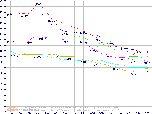 | [↑前グラフ]: | DiamondMax D540X (5400rpm,UltraATA/133,40GB/Platter)の最安値推移 |