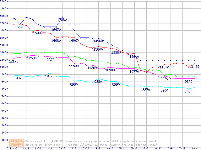 | [↑前グラフ]: | DiamondMax D540X (5400rpm,UltraATA/100,40GB/Platter,流体軸受)の最安値推移 |