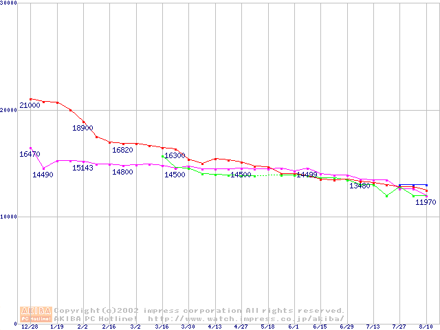 | [↑前グラフ]: | 2.5インチHDD 20GB~30GB未満(9.5mm厚)の最安値推移 |