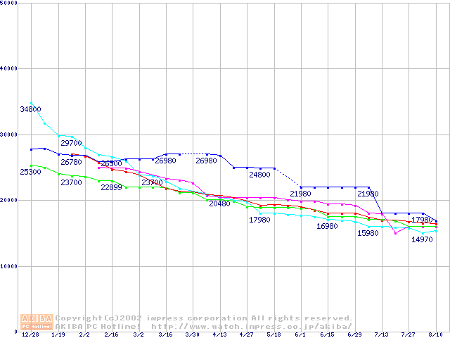 | [↑前グラフ]: | 2.5インチHDD 30GB~40GB未満(9.5mm厚)の最安値推移 |
