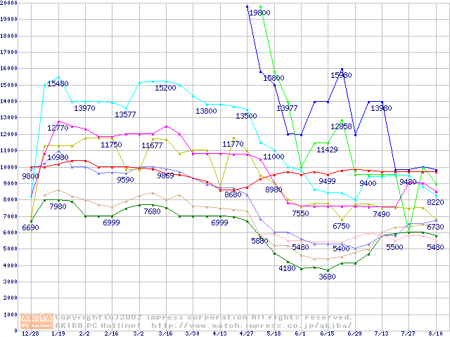 メモリ主要製品(最安値1万円以上)の最安値推移