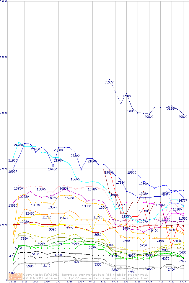 メモリ主要製品(最安値1万円以上)の最安値推移
