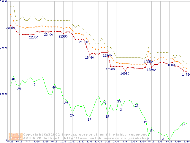 Socket 370 (FC-PGA,FSB 133MHz,L2 256KB)の最安値推移