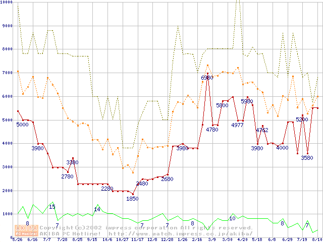 PC100 SDRAM DIMM CasLatency=2 ECC対応の最安値推移