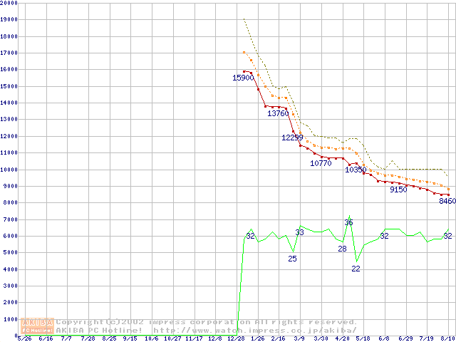 Socket 370 (FC-PGA2,FSB 100MHz,L2 256KB)の最安値推移
