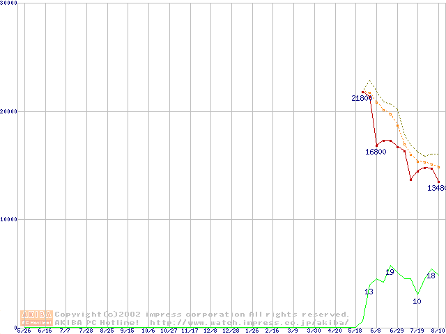 Travelstar 40GNX (9.5mm,5400rpm,UltraATA/100,20GB/Platter,8MB,流体軸受)の最安値推移