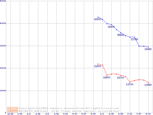 | [↑前グラフ]: | Travelstar 48GH (12.5mm,5400rpm,UltraATA/100,2MB,流体軸受)の最安値推移 |