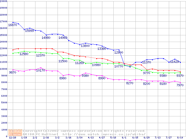 | [↑前グラフ]: | DiamondMax D540X (5400rpm,UltraATA/100,40GB/Platter,流体軸受)の最安値推移 |