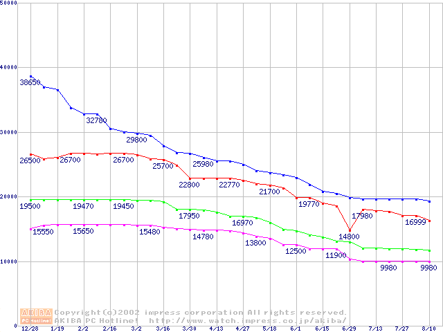 | [↓次グラフ]: | WD Caviar (7200rpm,UltraATA/100,20GB/Platter)の最安値推移 |