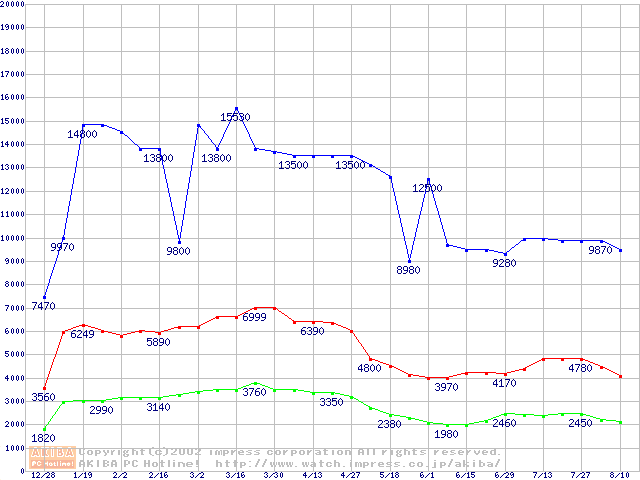 | [↓次グラフ]: | PC100 SDRAM DIMM CasLatency=2 ECC対応の最安値推移 |