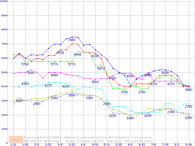 メモリ主要製品(最安値5千円~1万円未満)の最安値推移