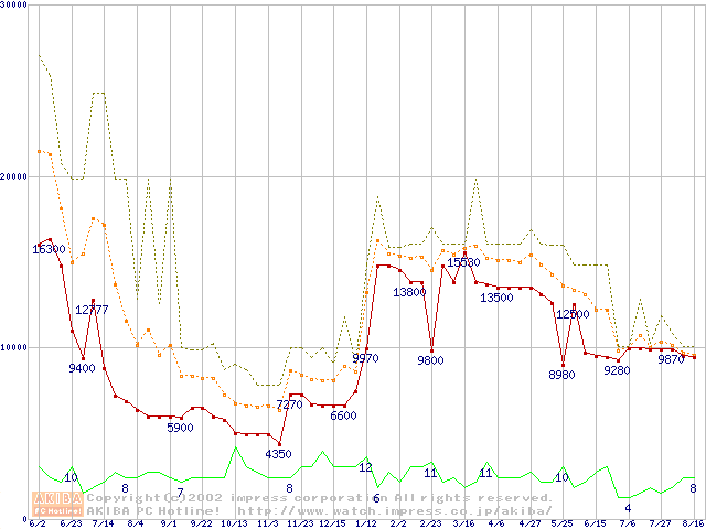 PC100 SDRAM DIMM CasLatency=2の最安値推移