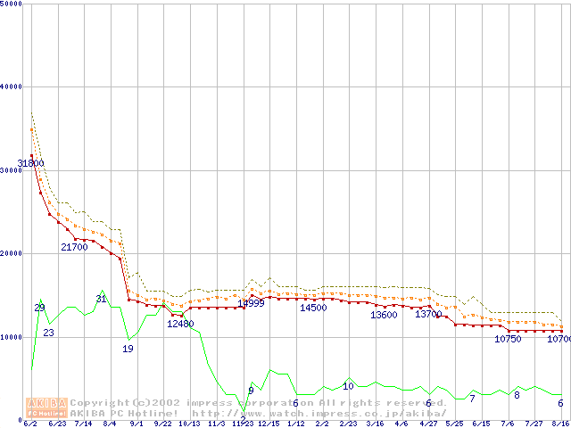 Socket A (Thunderbird,PGA,FSB 266MHz,L2 256KB)の最安値推移