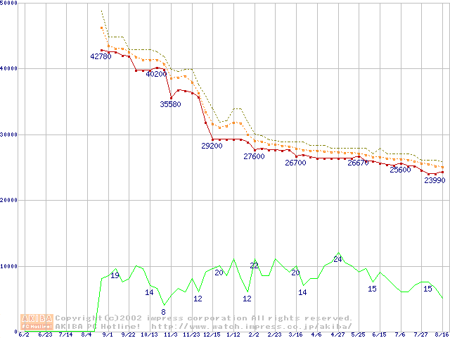 Socket 370 (FC-PGA2,FSB 133MHz,L2 512KB)の最安値推移