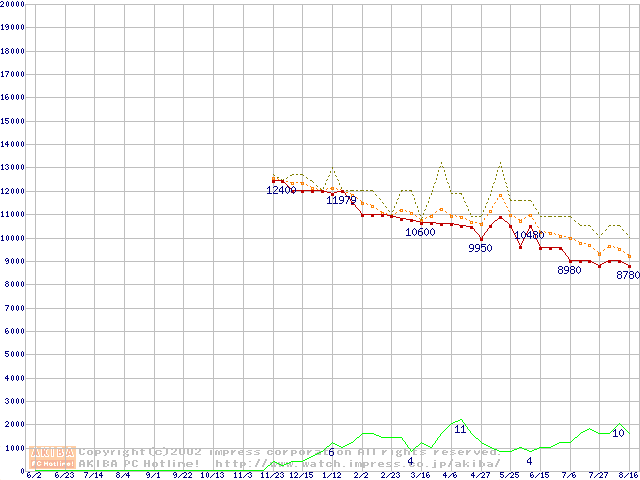 Travelstar 15GN (9.5mm,4200rpm,UltraATA/100,512KB,流体軸受)の最安値推移
