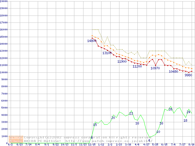 Travelstar 40GN (9.5mm,4200rpm,UltraATA/100,20GB/Platter,2MB,流体軸受)の最安値推移