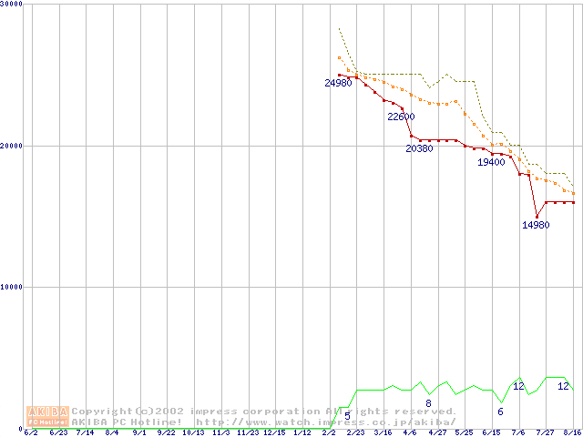 MHRシリーズ (9.5mm,4200rpm,UltraATA/100,2MB,20GB/プラッタ,流体軸受)の最安値推移