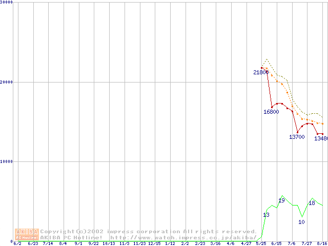 Travelstar 40GNX (9.5mm,5400rpm,UltraATA/100,20GB/Platter,8MB,流体軸受)の最安値推移