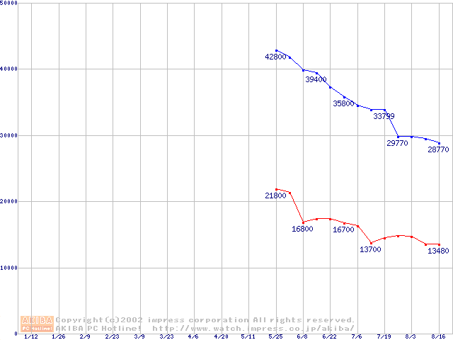 | [↑前グラフ]: | Travelstar 48GH (12.5mm,5400rpm,UltraATA/100,2MB,流体軸受)の最安値推移 |