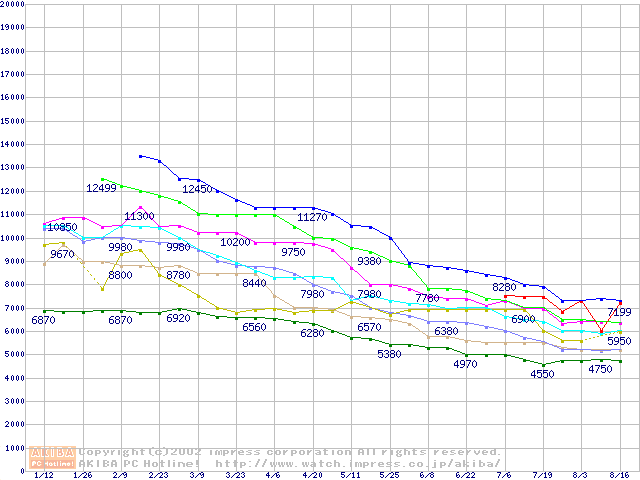| [↓次グラフ]: | Socket A (Spitfire,PGA,FSB 200MHz,L2 64KB)の最安値推移 |