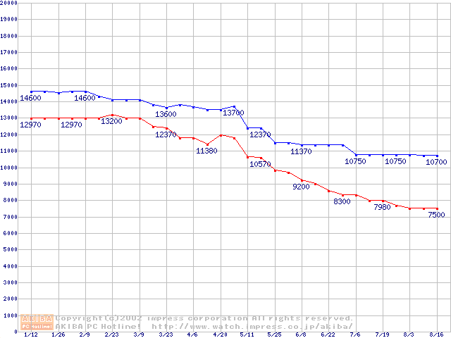 | [↓次グラフ]: | Socket A (Thunderbird,PGA,FSB 200MHz,L2 256KB)の最安値推移 |