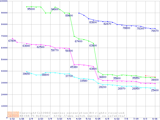 | [↑前グラフ]: | Socket 478 (micro-PGA,FSB 400MHz,L2 256KB,Willamette)の最安値推移 |