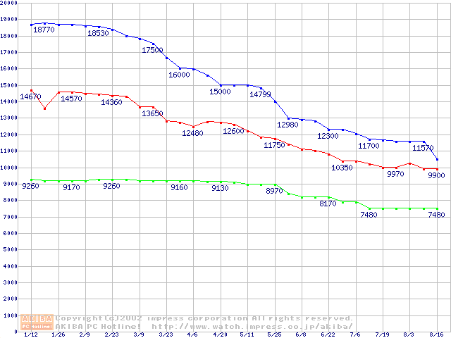 | [↑前グラフ]: | DiamondMax Plus D740X (7200rpm,UltraATA/133,40GB/Platter,流体軸受)の最安値推移 |