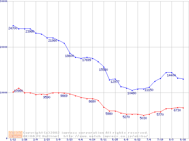 | [↓次グラフ]: | PC3000(DDR366) DDR SDRAM DIMMの最安値推移 |