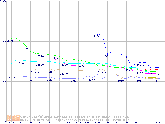 | [↓次グラフ]: | 2.5インチHDD主要製品(最安値1万5千円~2万円未満)の最安値推移 |
