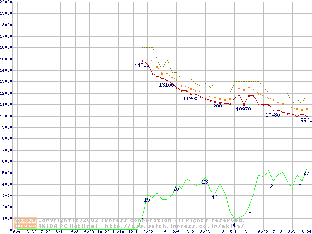 Travelstar 40GN (9.5mm,4200rpm,UltraATA/100,20GB/Platter,2MB,流体軸受)の最安値推移