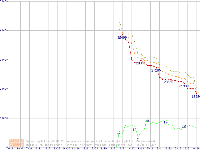 Socket A (Palomino,OPGA,FSB 266MHz,L2 256KB)の最安値推移