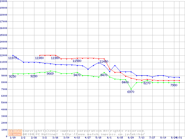 | [↑前グラフ]: | 2.5インチHDD主要製品(最安値3万円以上)の最安値推移 |