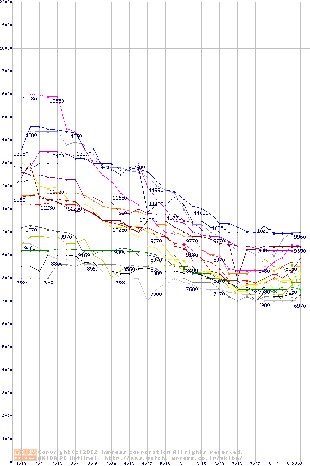 HDD主要製品(最安値1万円~1万5千円未満)の最安値推移