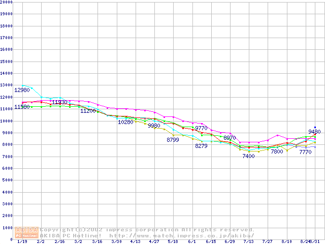 | [↑前グラフ]: | HDD 20GB~30GB未満(7200rpmクラス)の最安値推移 |