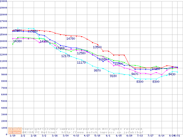 | [↑前グラフ]: | HDD 40GB~50GB未満(7200rpmクラス)の最安値推移 |