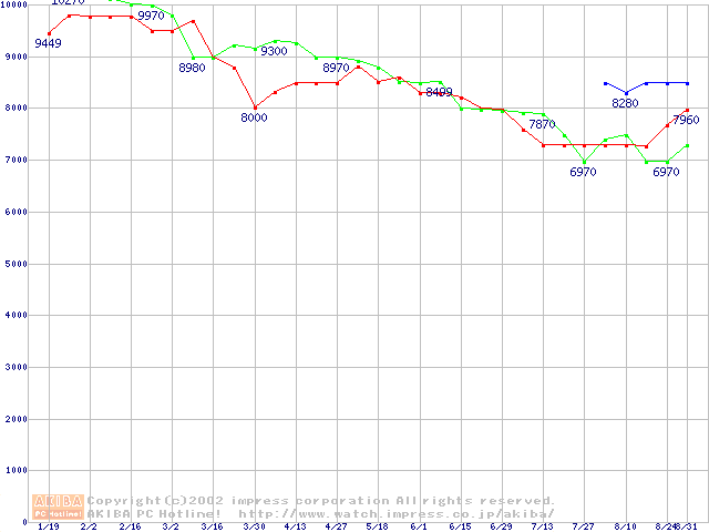 | [↑前グラフ]: | HDD 30GB~40GB未満(5400rpmクラス)の最安値推移 |